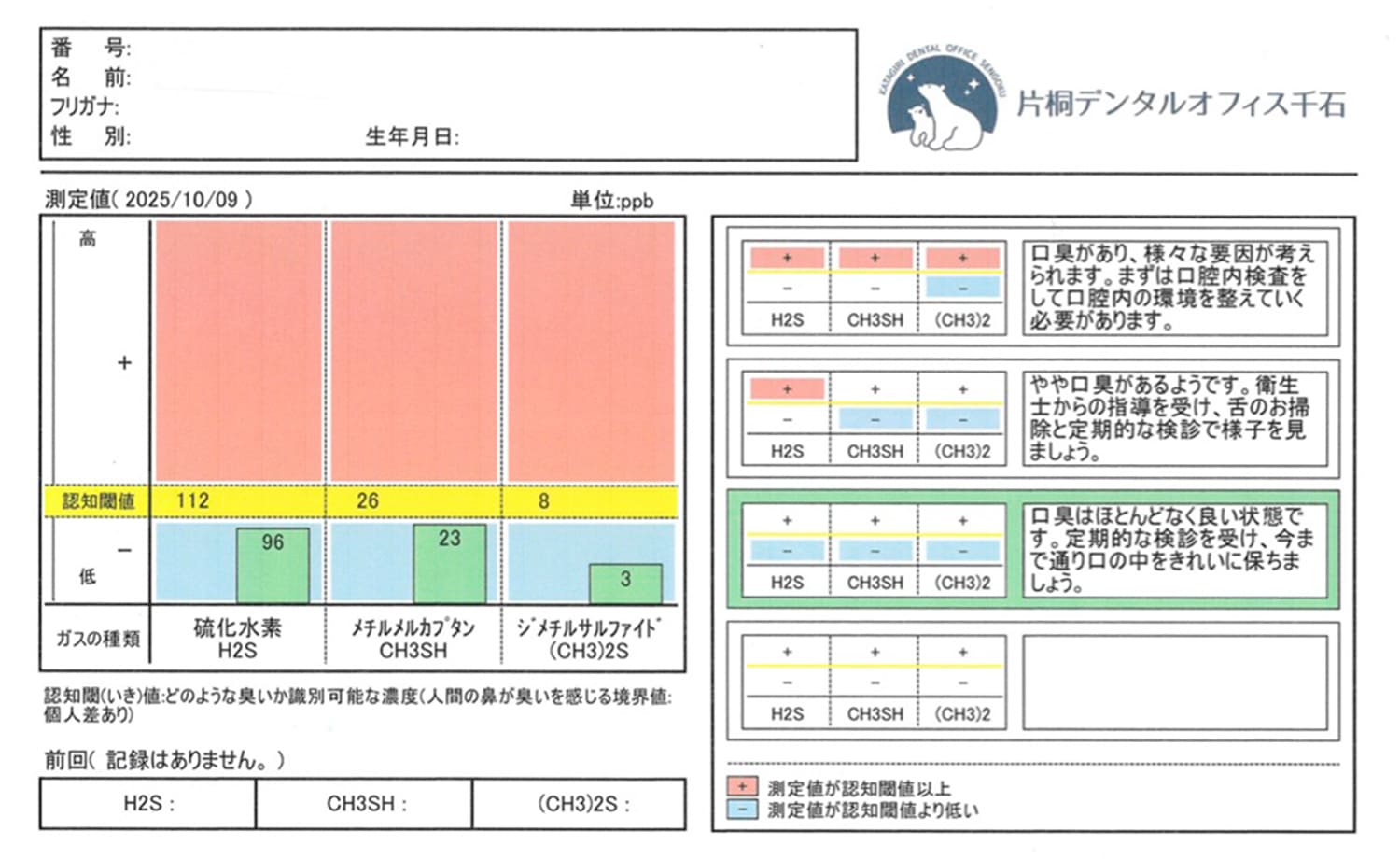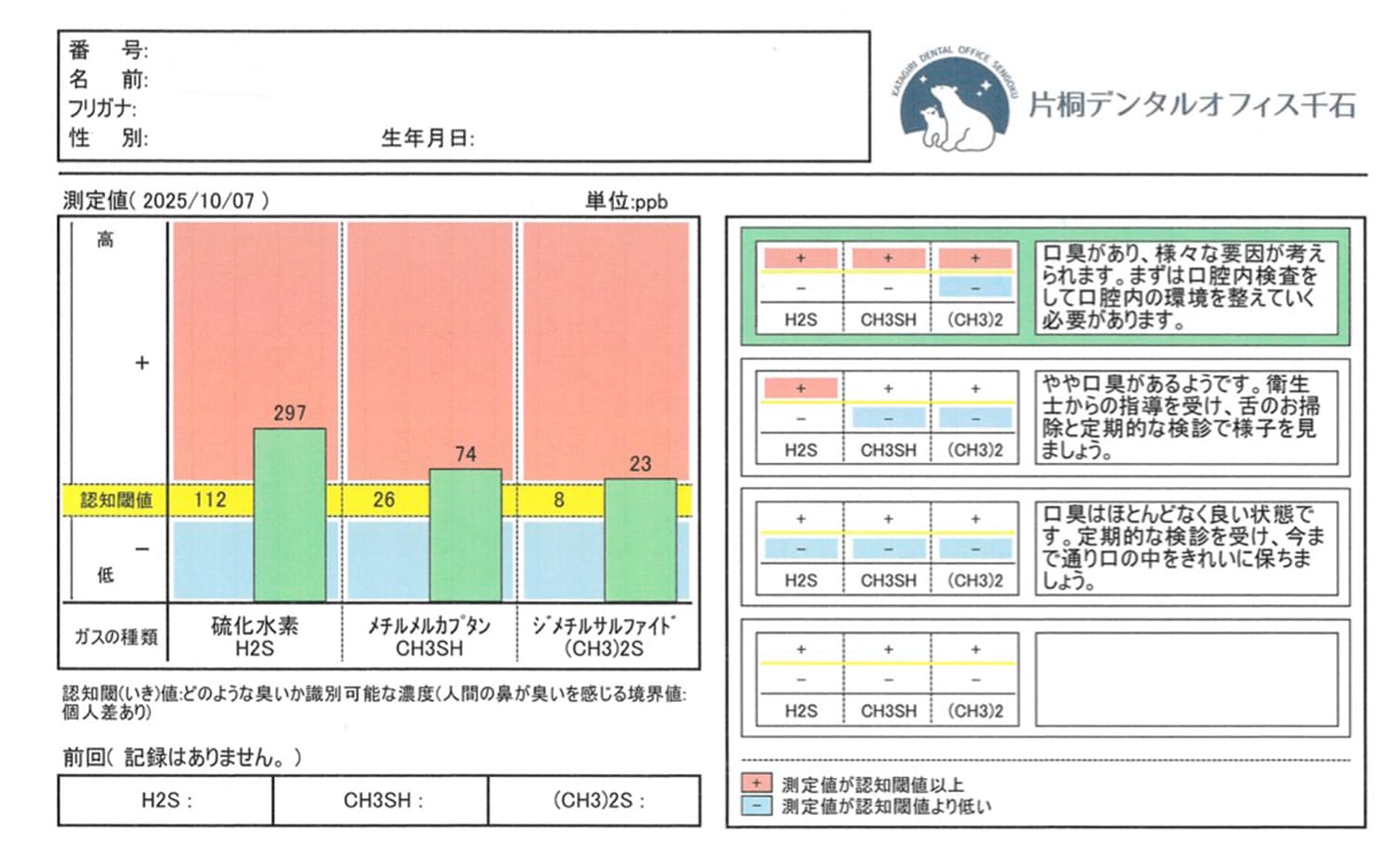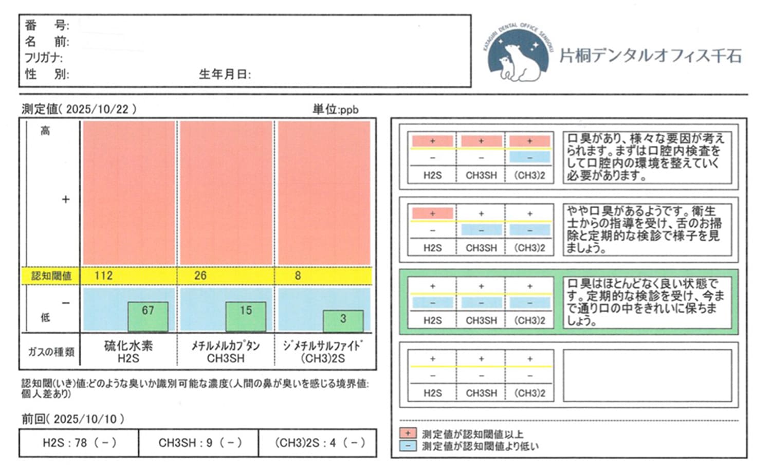 ひと通りの治療が終わり、定期検診・メインテナンスへ移行した。治療後に再度口臭検査(オーラルクロマ)を行なったところ、すべての項目において認知閾値以下となり口臭の改善を認めた。ご家族からも以前より口臭が改善したと喜んでいただいている。